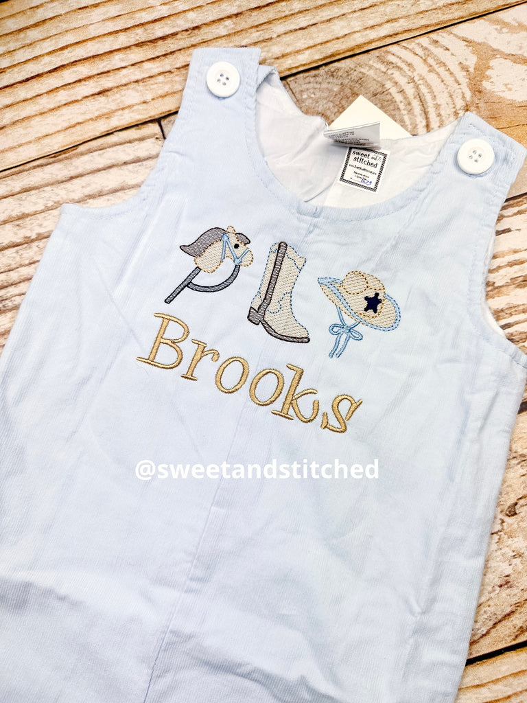 Personalized, Embroidered Boys Rodeo or cowboy Outfit in a lightweight corduroy with cowboy hat and boots and name! Boys Longall (Overalls) is perfect for cake smash or 1st birthday party or a rodeo!