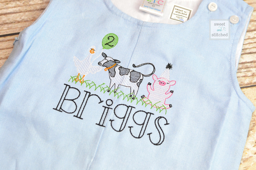 Monogrammed Jon Jon (romper) makes a perfect 1st birthday or cake smash outfit in a woven cotton with a farm animal birthday design and name! Available in 3M, 6M, 9M, 12M, 18M, 2T and 3T.