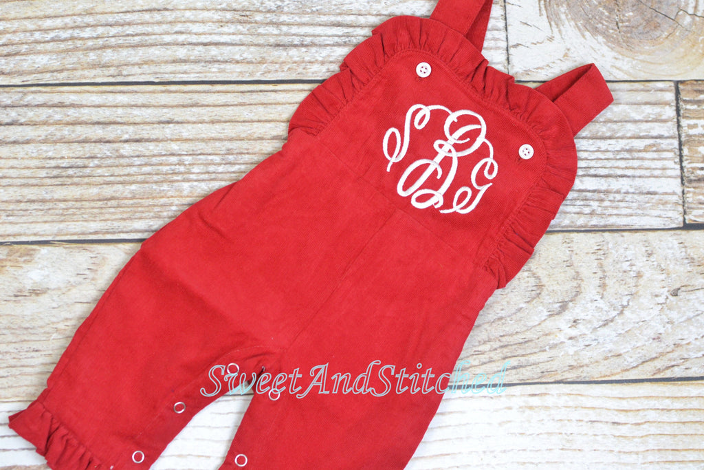 Personalized, Embroidered Red or white girls Christmas or Valentine's Ruffle Overalls! Girls Ruffle Overalls shown monogram in white. Please convo me to add a Christmas design. If you prefer GREEN embroidery, please put in personalization notes.