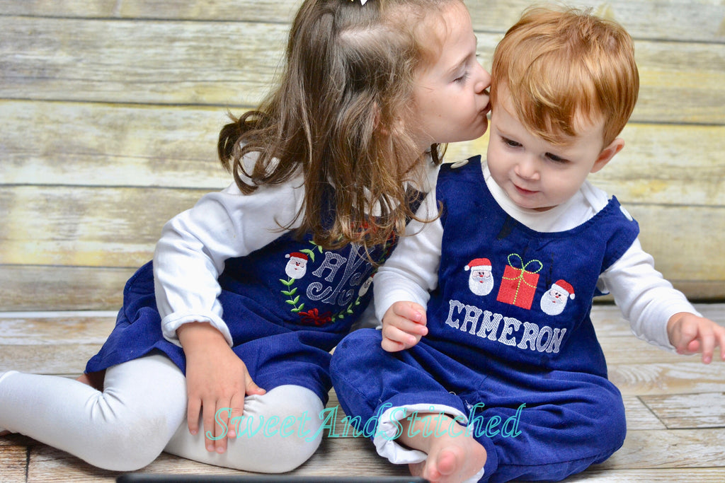 Monogrammed Corduroy Christmas dress in navy with santa monogram, Girls personalized Christmas dress, coordinating sibling Christmas outfits