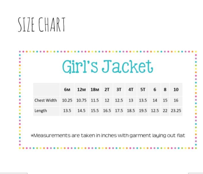 Sizing for jackets is as follows: 12M, 18M, 2T, 3T, 4T, 5T, and 6.