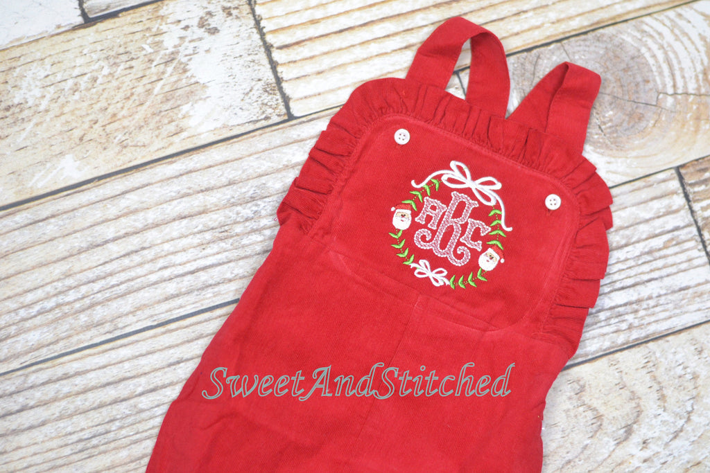 Personalized, Embroidered Red Christmas overalls with adorable present design or santa monogram! Girls Ruffle Overalls shown with plain monogram in white in alternate photos if preferred. Please convo me to add a different Christmas design - three trees would be adorable as well. If you prefer GREEN embroidery, please put in personalization notes.