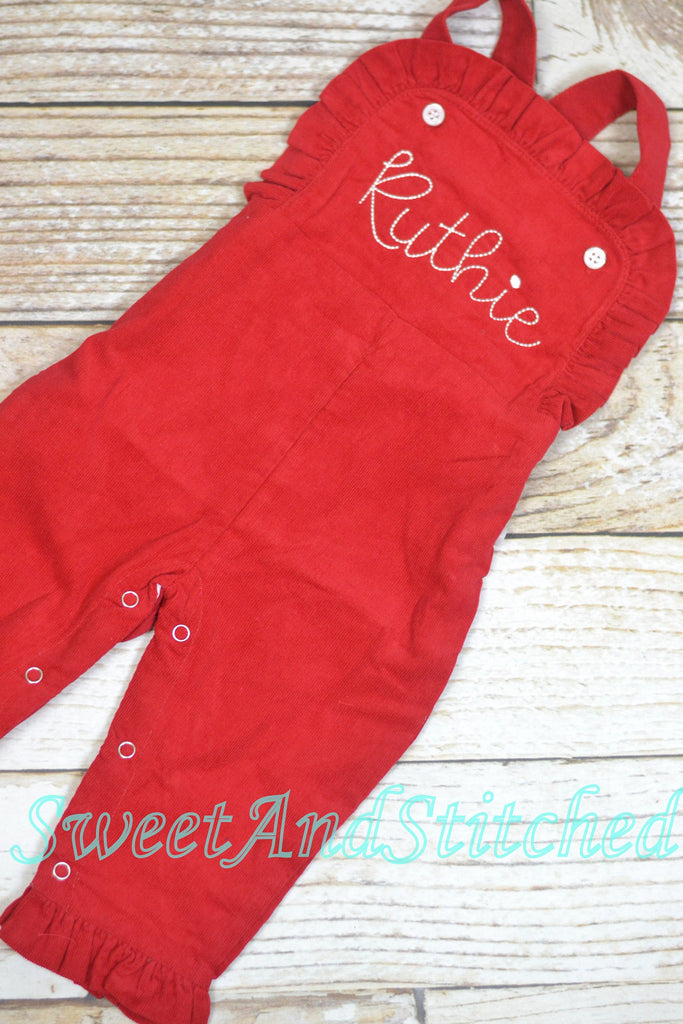 Personalized, Embroidered Red or white girls Christmas or Valentine's Ruffle Overalls! Girls Ruffle Overalls shown with name in white (monogram in alternate photos). Please convo me to add a Christmas design. If you prefer a different color embroidery, please put in personalization notes.