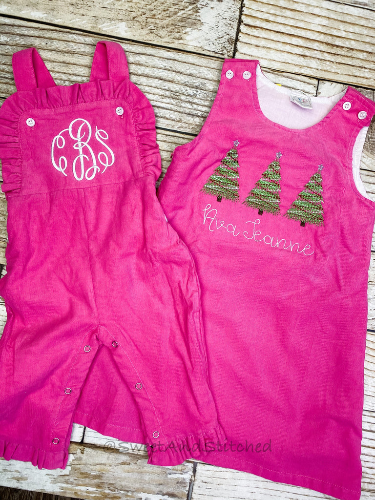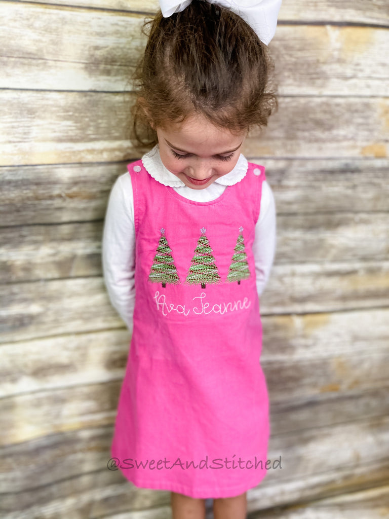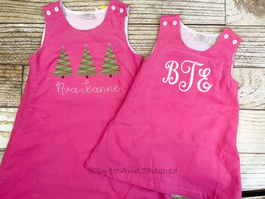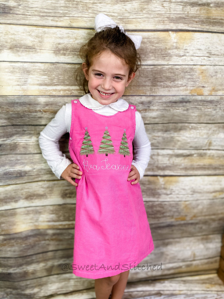Girls Christmas Dress in Pink Corduroy with green Christmas trees design! Girls monogrammed Christmas Dress (jumper). This dress is also perfect for fall with a pumpkin OR PLAIN white monogram, and perfect for Valentine's with a heart design or red or white monogram. Currently available in 6M, 12M, 18M, 2T, 3T, 4T, 5T and 6.