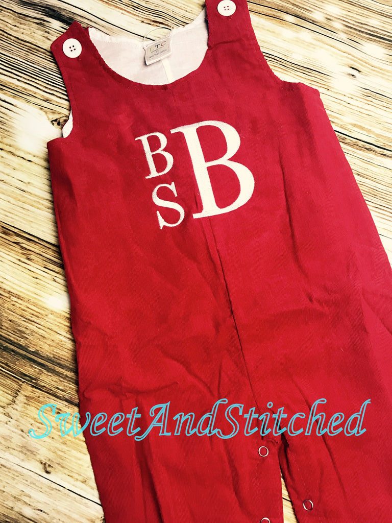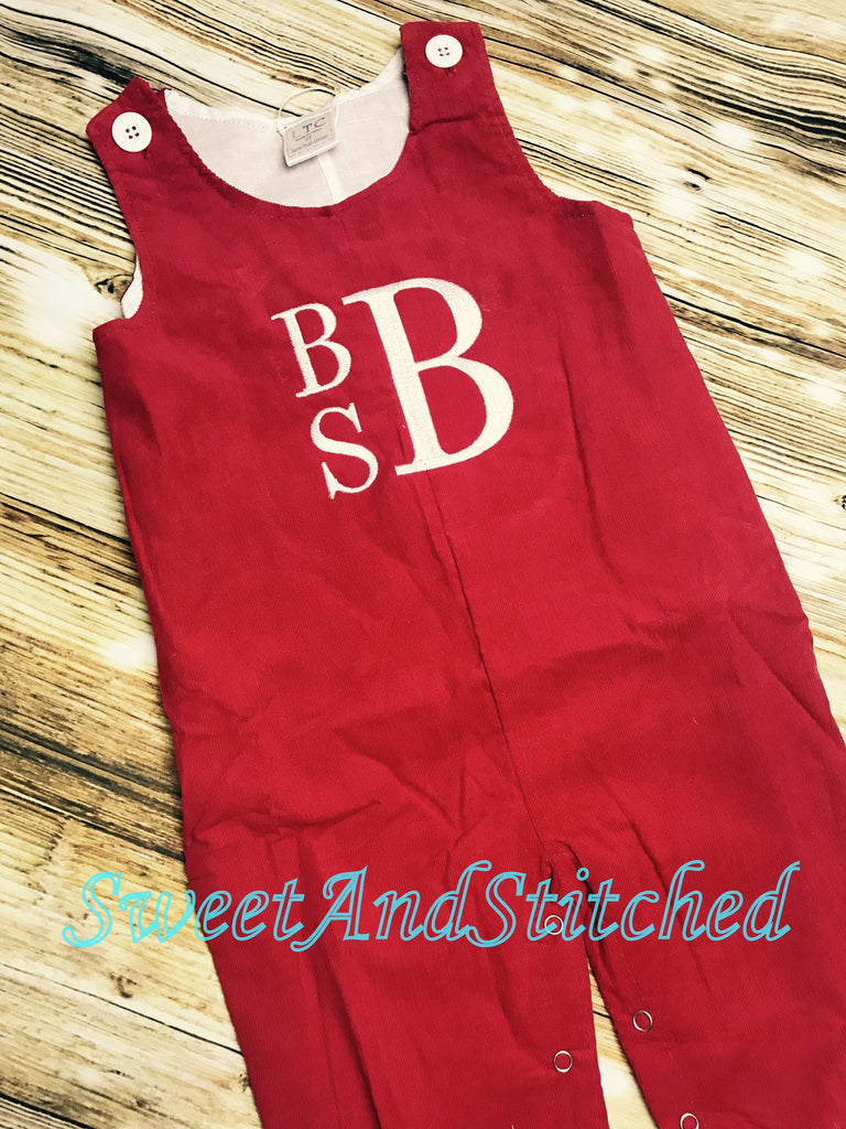 Monogrammed Boys Christmas Outfit! Boys Corduroy Longall (Jon Jon) with name or monogram in white (or green, request in Notes to Seller). Currently available in 3M, 6M, 9M, 12M, 18M, 2T, 3T.