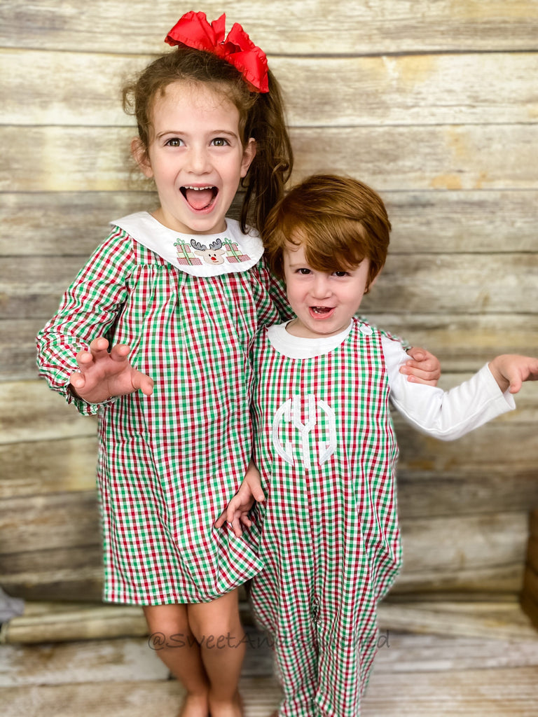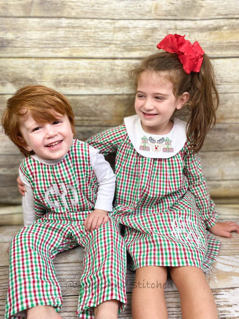 Monogrammed faux smocked Christmas outfit boys in christmas plaid gingham, Boys Christmas overalls, boys 1st Christmas outfit reindeers