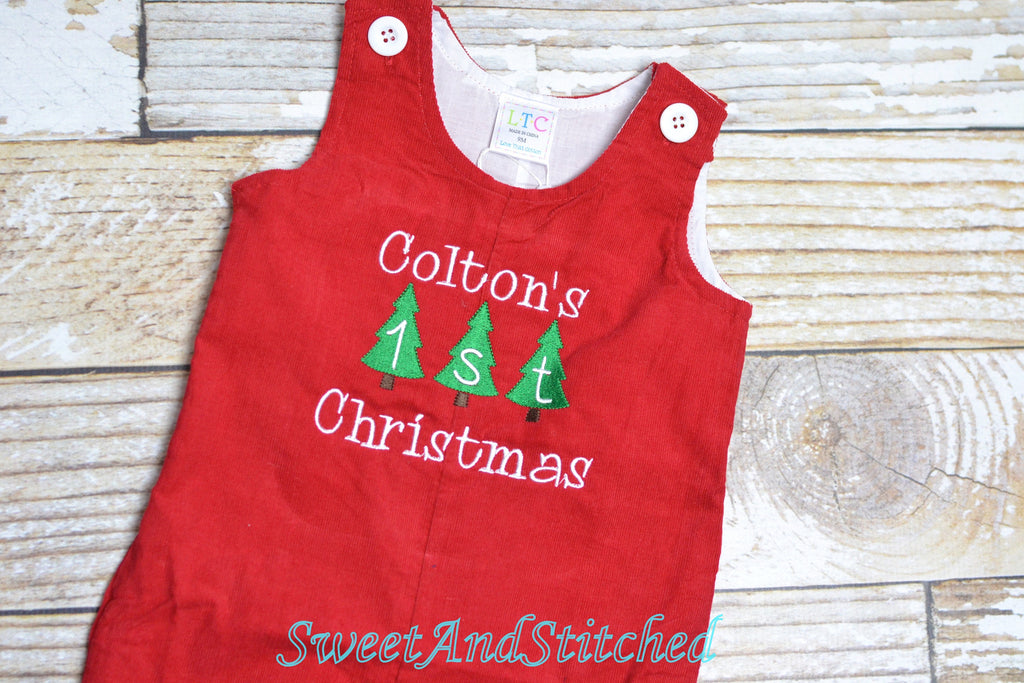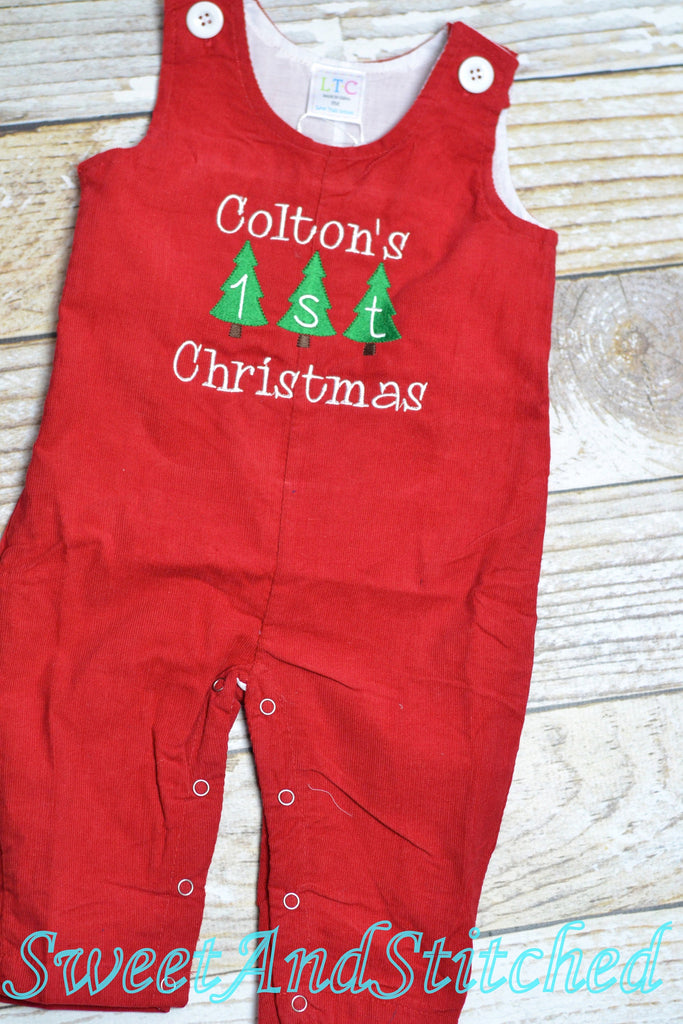 Personalized Baby Boy 1st Christmas outfit - monogrammed Christmas corduroy overalls