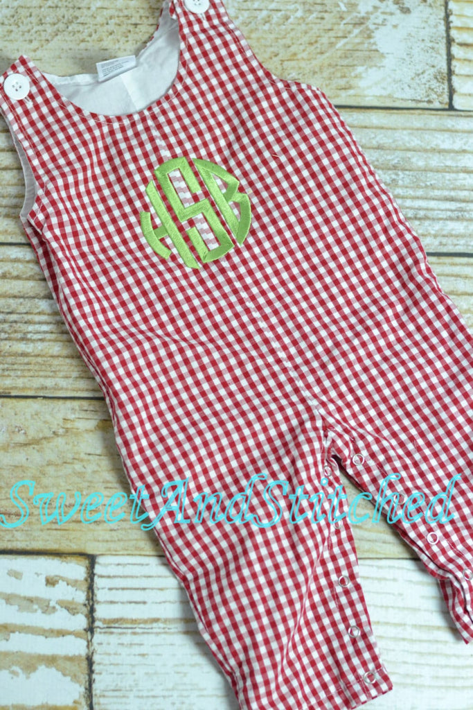 Personalized, Embroidered Boys Christmas Outfit! Boys Christmas Longall ( long Jon Jon) with design, name or monogram in green. Currently available in 3M, 6M, 9M, 12M, 18M, 2T, 3T.