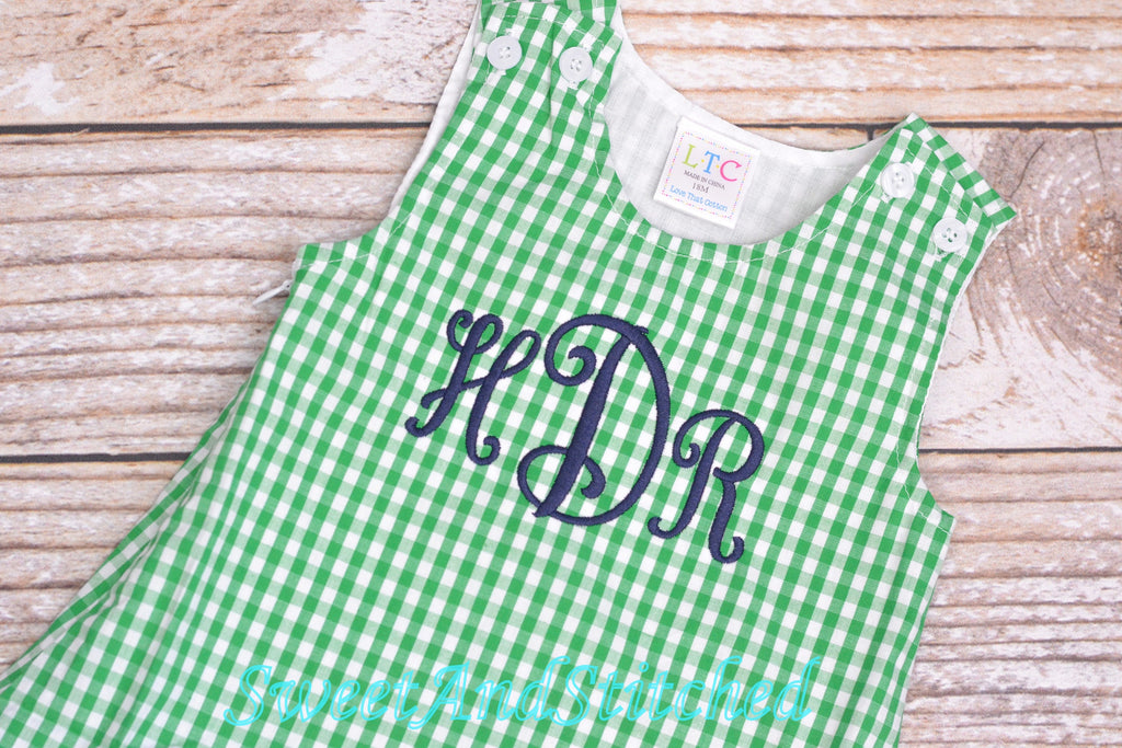 Monogrammed Spring, Easter or St. Patrick's Day Dress for girls in green gingham with navy monogram! Girls monogrammed toddler Christmas Dress (jumper) with name or monogram. Currently available in 6M, 12M, 18M, 2T, 3T, 4T, 5T, and 6.