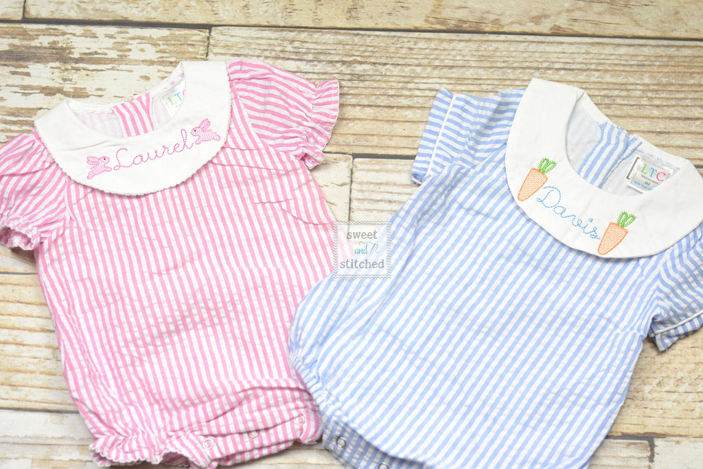 Monogrammed boys Easter outfit in baby blue seersucker with cross design on collar. Boys bishop bubble is perfect for baby boy's 1st easter! Available in 3M, 6M, 9M, 12M, 18M, 2T, and 3T.