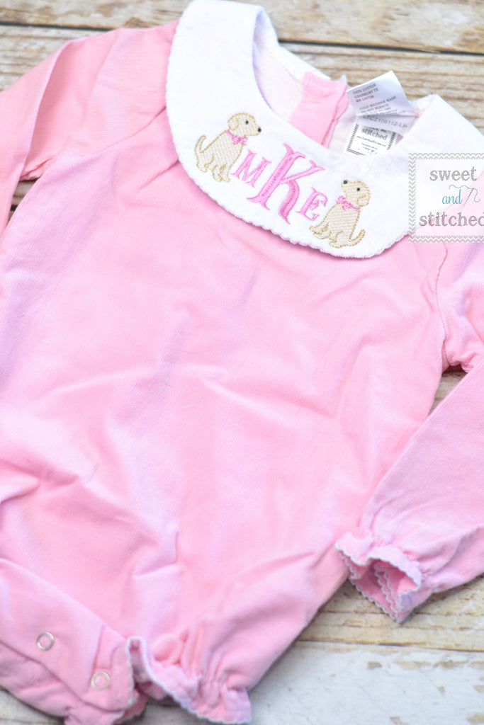 Personalized, Embroidered pink corduroy bishop bubble with sweet monogram and puppy dog design! Please convo me to add a different mini design.
