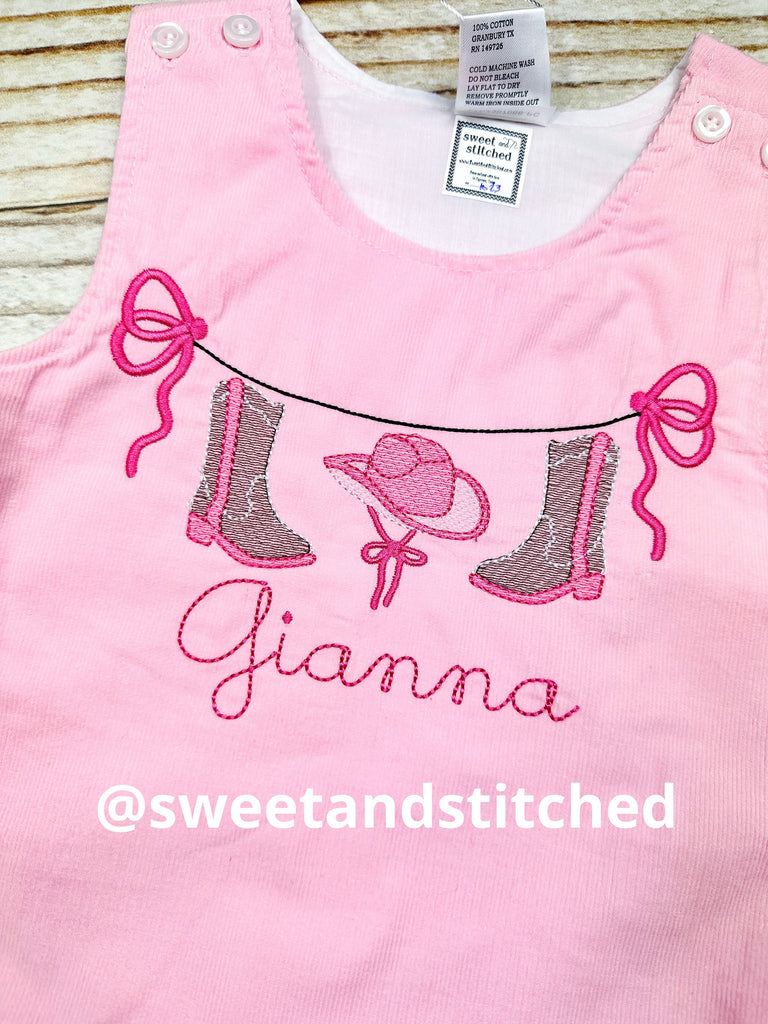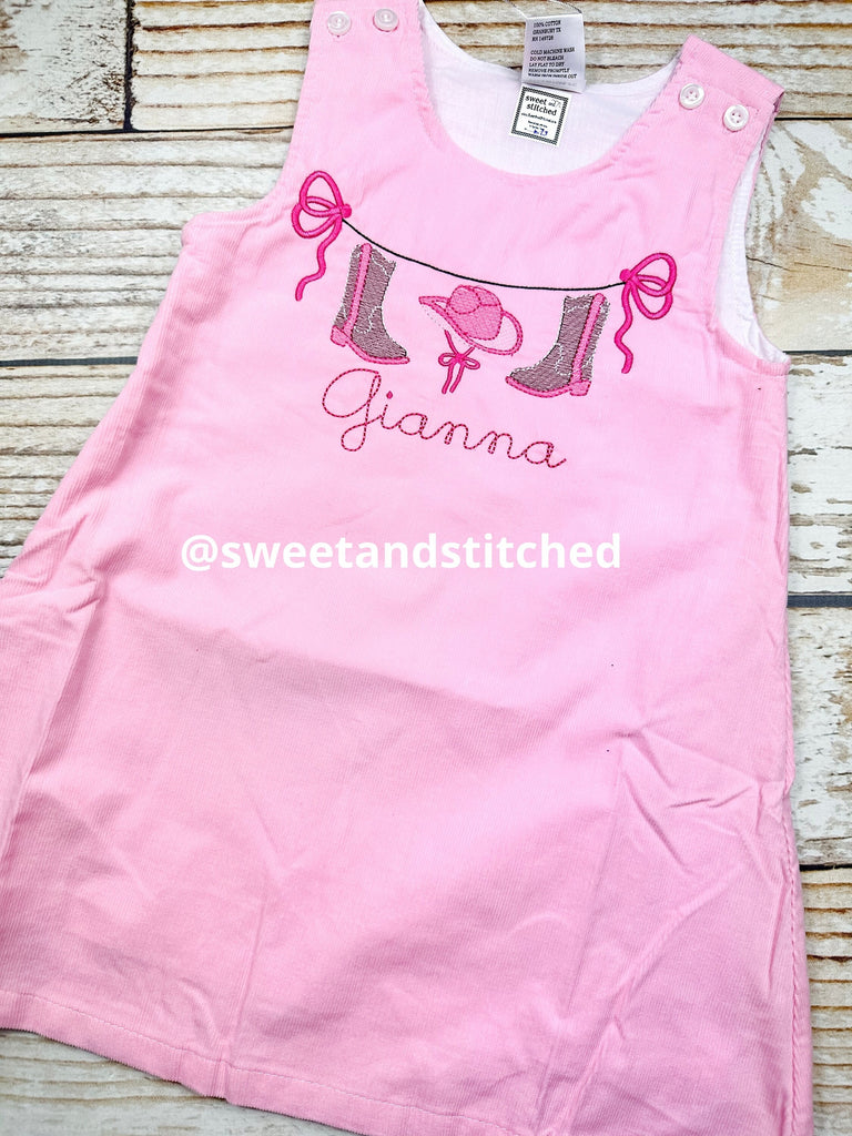 Personalized, Embroidered pink corduroy monogrammed jumper dress perfect for cowgirl or boots themed birthday party or cake smash! Girls corduroy jumper dress shown with cowboy design and name. Please convo me to add a different design.