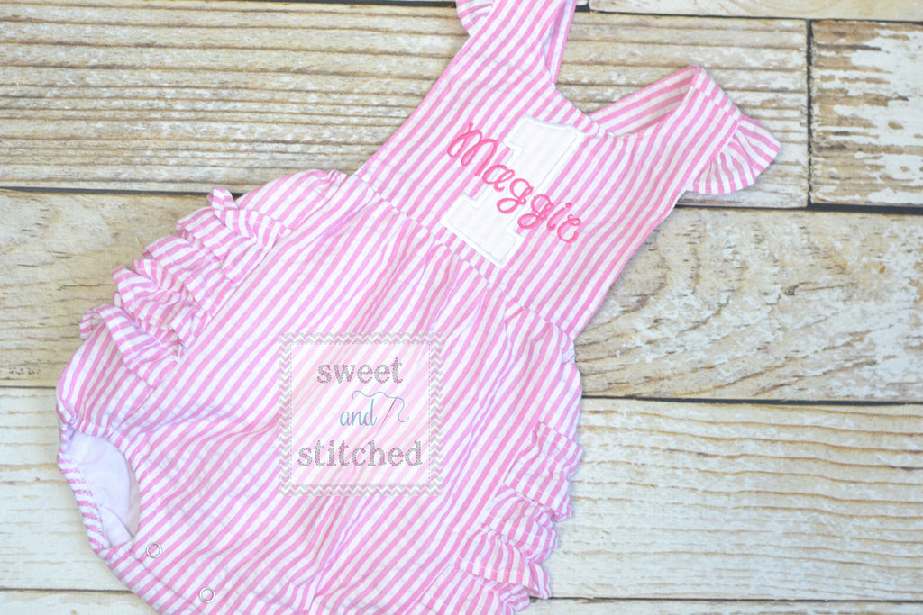 This listing is an adorable 1st birthday Monogrammed seersucker ruffle bubble for baby girl with an added applique 1 and name for 1st birthday! This is a perfect cake smash outfit or romper - great for cake smash photo shoot or birthday party. Shown in pink and white. PLEASE convo me to inquire about other color schemes, fabrics, thread colors. Possibilities are endless!