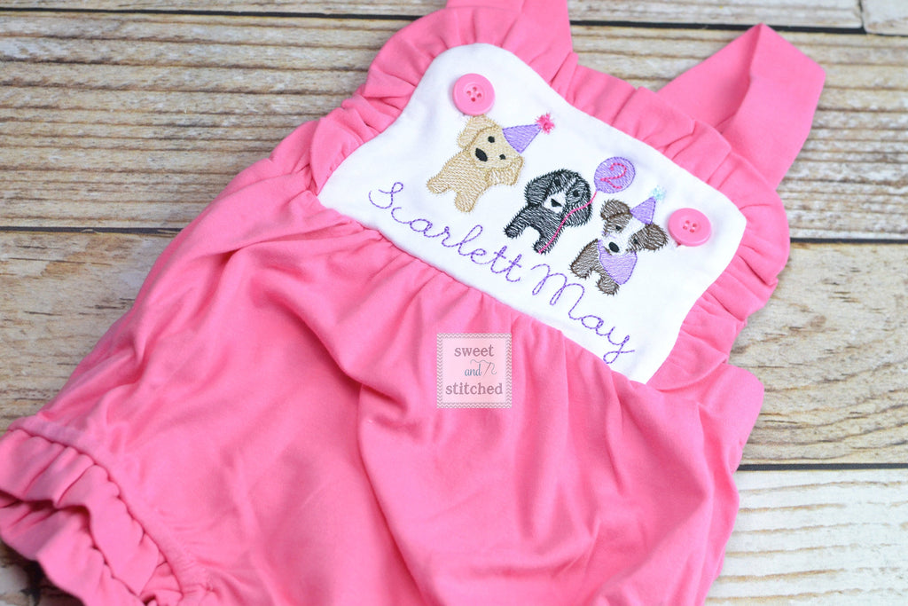 Monogrammed baby girl cake smash outfit with puppy dogs and name on color block pink and white, 1st birthday puppy themed cake smash outfit