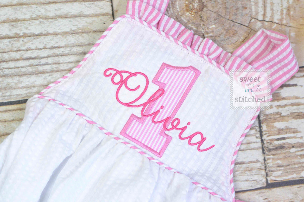This listing is an adorable seersucker ruffle bubble romper with pink trim, pink 1 and name. This is a perfect cake smash outfit, or 1st Birthday outfit for baby girls. Alternate photo shows aqua 1 and name. If you'd like aqua you MUST put in personalization notes with name. Standard order will come with pink one.