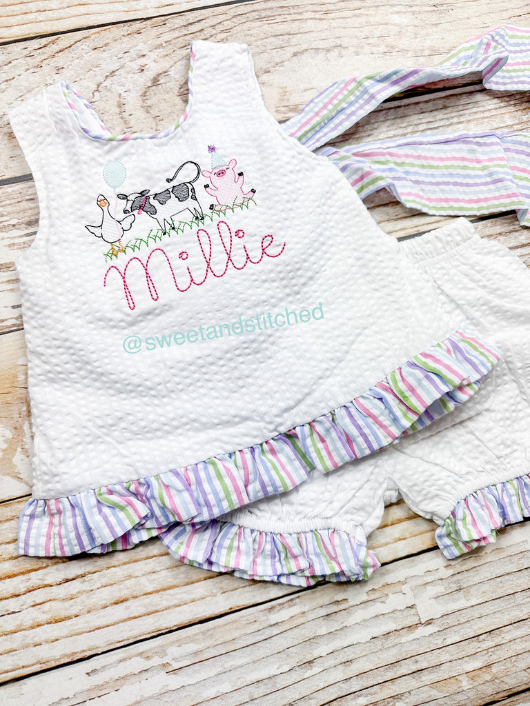 This listing is an adorable seersucker swing bloomer set with a farm animal birthday design! This is a perfect cake smash outfit for baby girl's first birthday or farm themed cake smash.