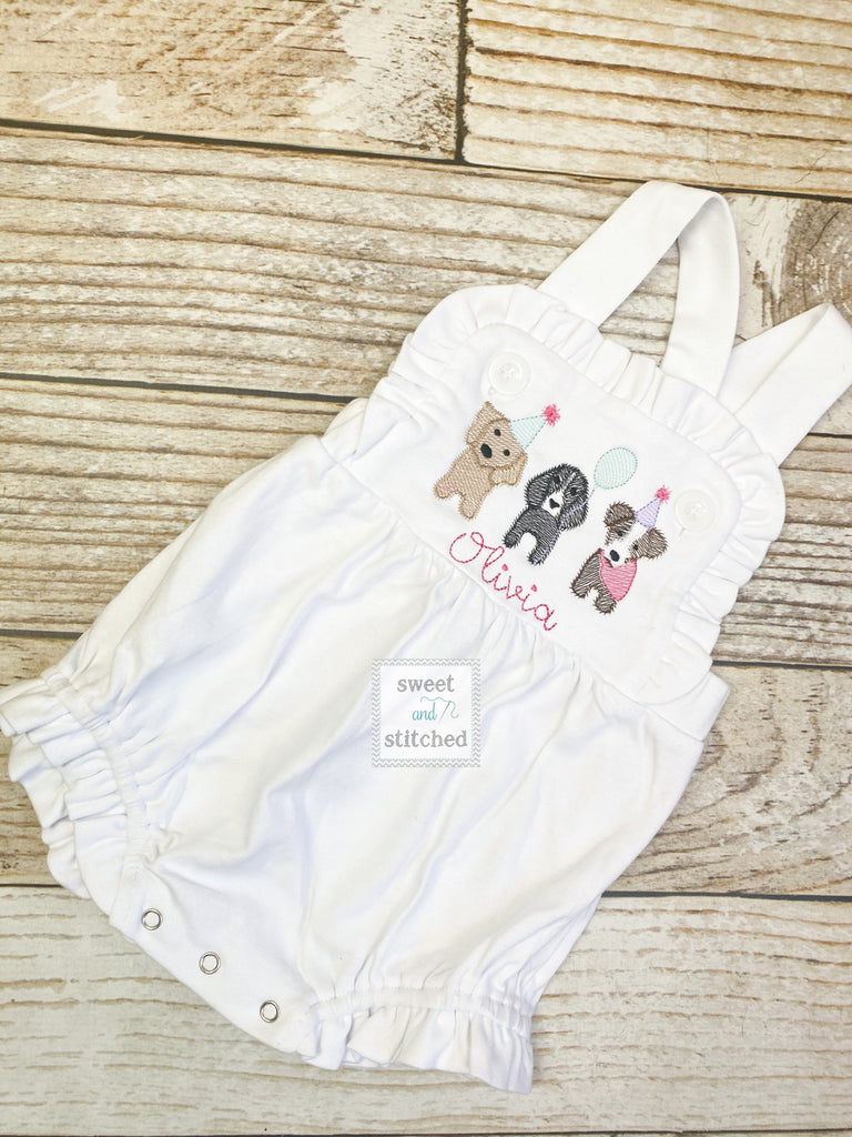 Monogrammed baby girl cake smash outfit with puppy dogs and name, girls birthday bubble outfit, 1st birthday puppy themed cake smash outfit