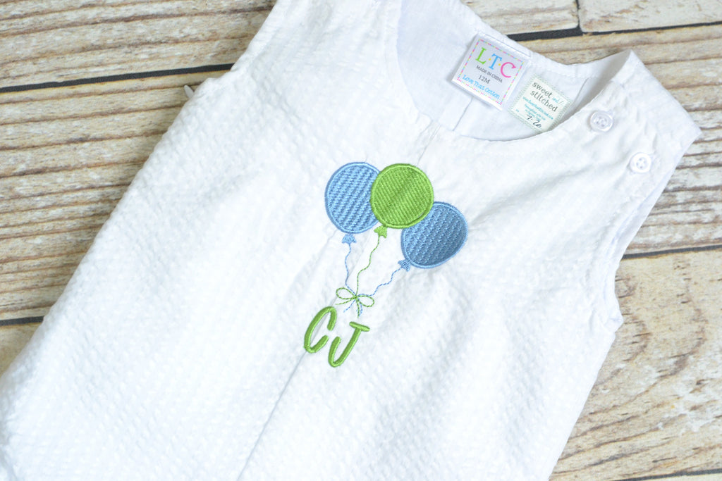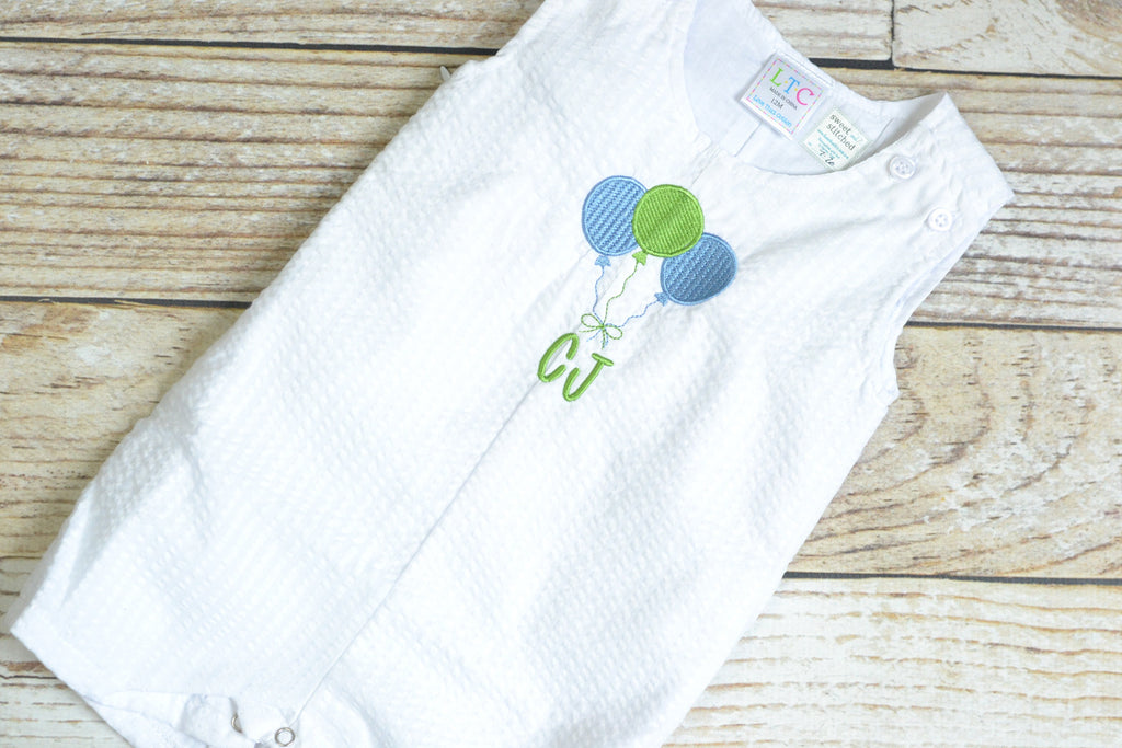 Monogrammed baby boy romper with vintage balloon design, perfect for cake smash or 1st birthday party! . Baby boy cake smash outfit in white seersucker.