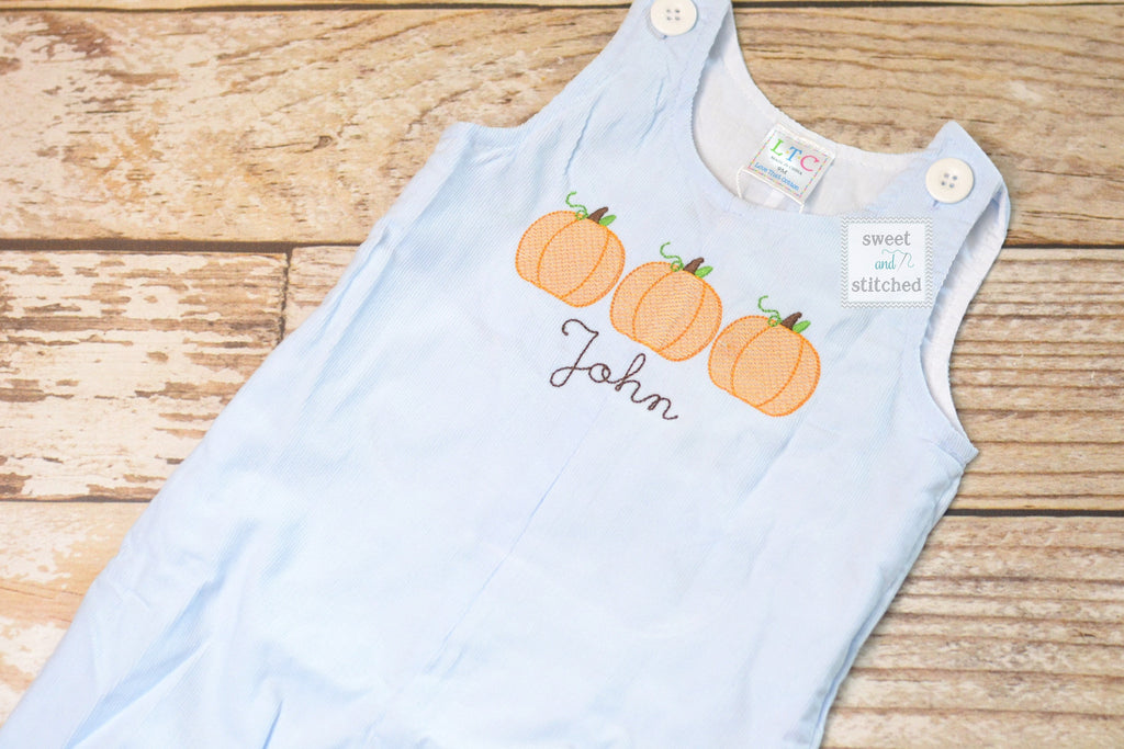 Monogrammed boys pumpkin overalls in baby blue corduroy, Boys halloween fall outfit with pumpkins, baby boy thanksgiving outfit