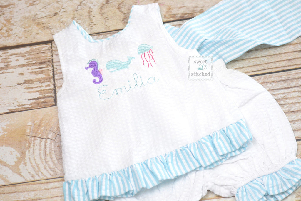 Baby girl swing back bloomer set in aqua with sea animals, summer baby girl outfit, mermaid cake smash bloomer set, 1st birthday outfit