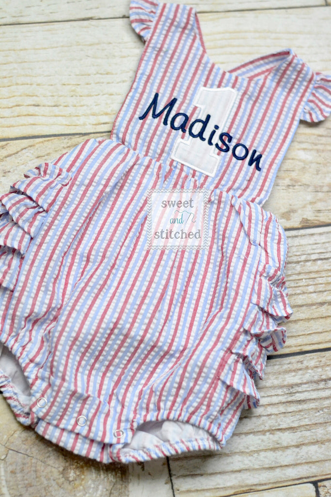 This listing is an adorable 1st birthday Monogrammed seersucker ruffle bubble for baby girl with an added applique 1 and name for 1st birthday! This red white and blue seersucker is a perfect cake smash outfit for a summer birthday, memorial day or 4th of july. Please let me know if you'd like a name ONLY without the number 1.